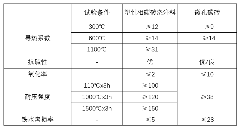 塑性相碳磚澆注料不是自焙碳磚,他們完全不是一回事,他們的材料成分、施工工藝、運(yùn)作機(jī)理有著巨大的差別。塑性相碳磚澆注料不需要燒成,而且它本身在常溫下有很高的導(dǎo)熱性能和強(qiáng)度。常溫(20℃)導(dǎo)熱系數(shù)大于10W/(m·k),耐壓強(qiáng)度大于30Mpa。