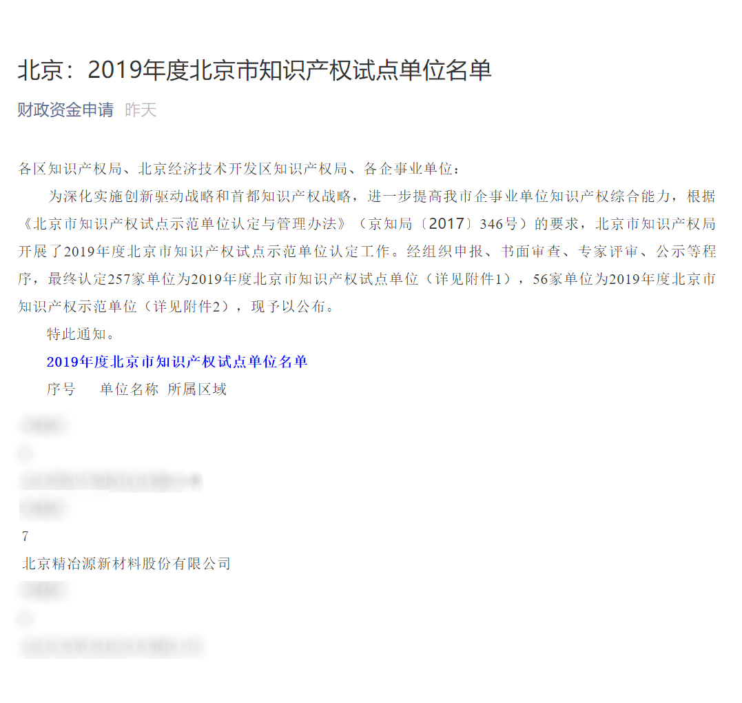 2019年12月下旬,北京精冶源新材料股份有限公司(簡(jiǎn)稱:精冶源;股票代碼:831091)歷經(jīng)嚴(yán)格而規(guī)范的書面審查、專家評(píng)審、公示等多項(xiàng)程序,被北京市知識(shí)產(chǎn)權(quán)局認(rèn)定為2019年度北京市知識(shí)產(chǎn)權(quán)試點(diǎn)單位。 此次認(rèn)定要求企業(yè)屬于知識(shí)產(chǎn)權(quán)密集型產(chǎn)業(yè)領(lǐng)域,有持續(xù)創(chuàng)新活動(dòng),有一定數(shù)量的專利申請(qǐng)且近三年專利實(shí)施率不低于40%等多…
